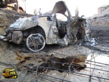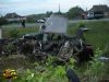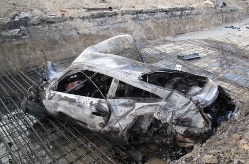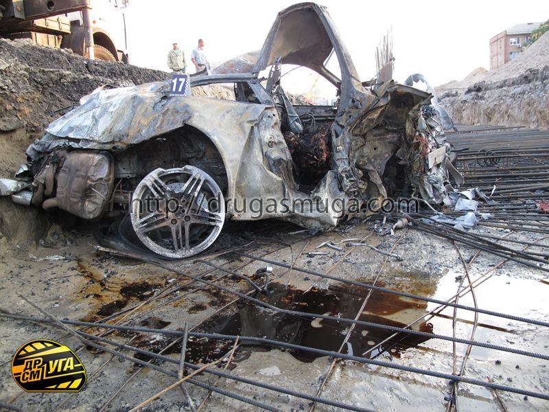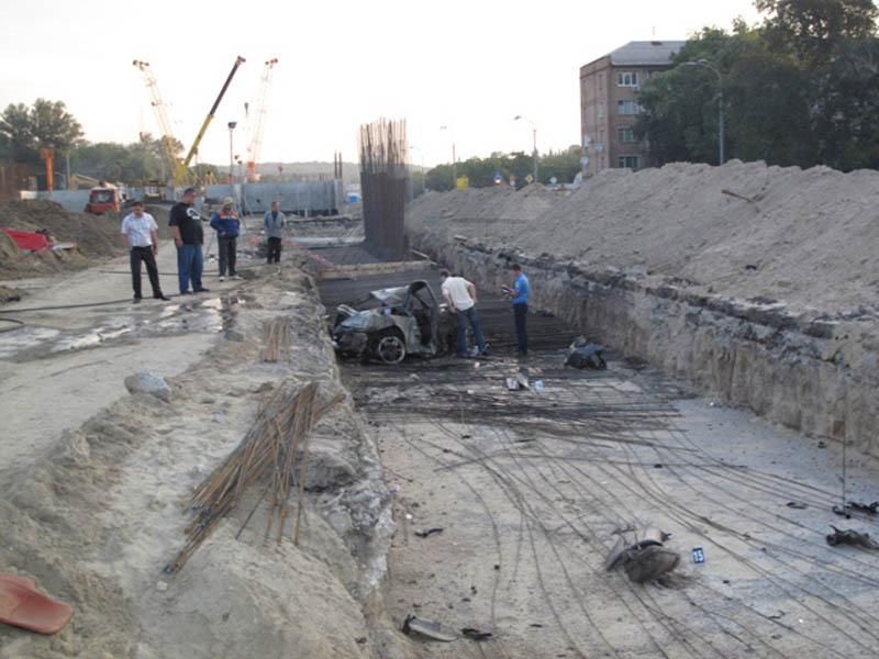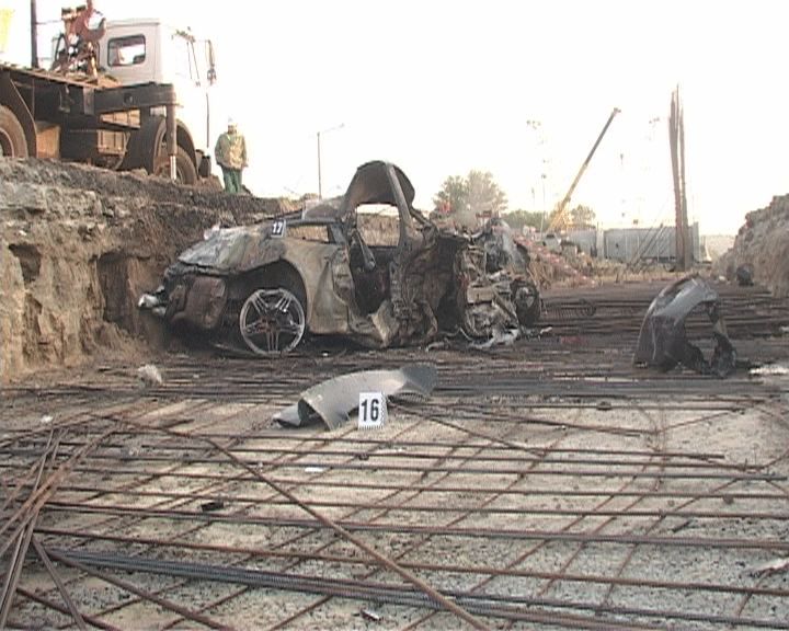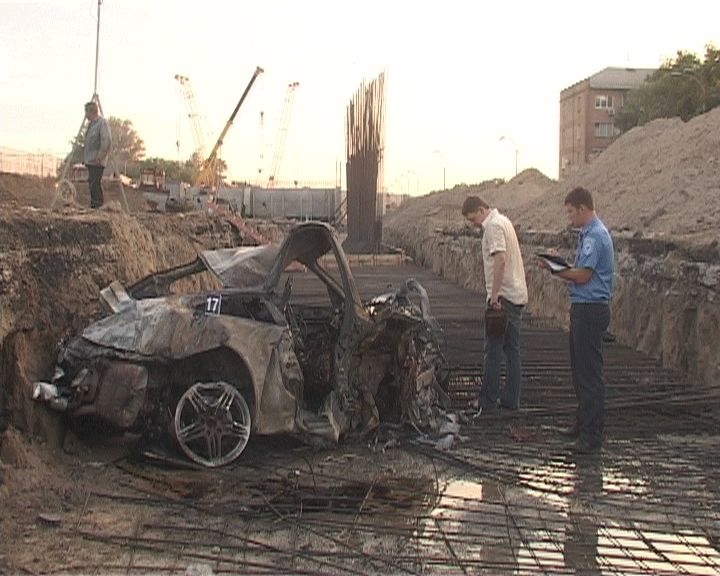 Удар был такой силы, что бетонные блоки отбросило от места столкновения на несколько десятков метров. А сам автомобиль упал в котлован глубиной около 1,5 метров, пролетев в общей сложности около 200 метров и загорелся.