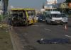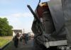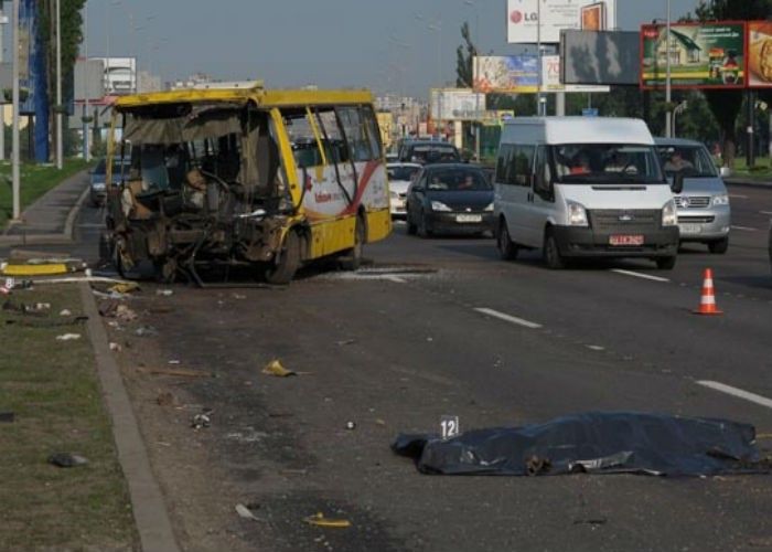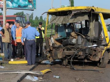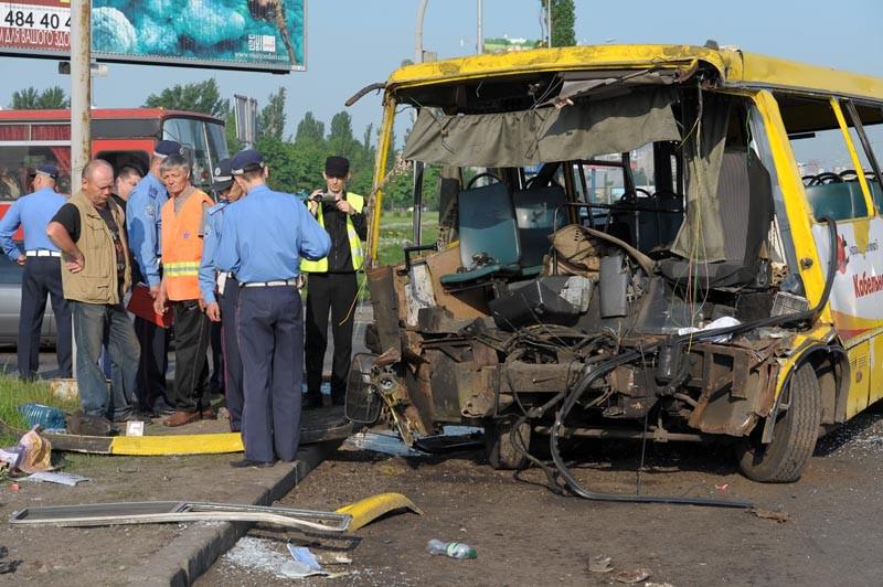 По свидетельству очевидцев он проезжал перекресток уже на запрещающий сигнал светофора, хотя на месте происшествия водитель утверждал, что для него только начал мигать зеленый. В это время перпендикулярно движению грузовика от улицы Коллекторной в направлении Харьковского шоссе двигался автобус Богдан. Маршрутка врезалась в колесо и правый бок фуры, а затем и прицепа, сильно повредив его. В результате Богдан остался без лобового стекла, торпедо и с воздуховодов, рулевой колонкой и других атрибутов передней части маршрутки. После удара маршрутку развернуло на 90 градусов.