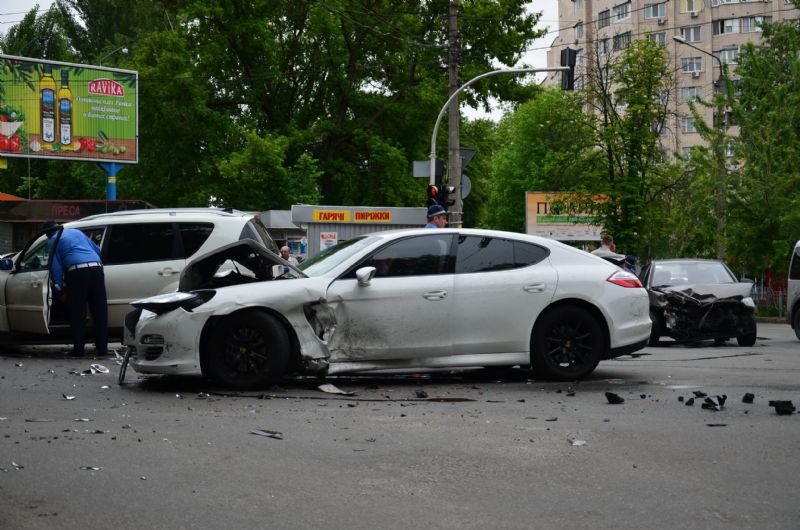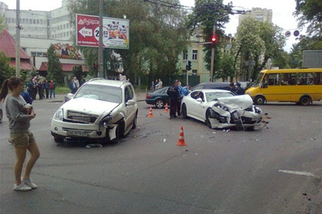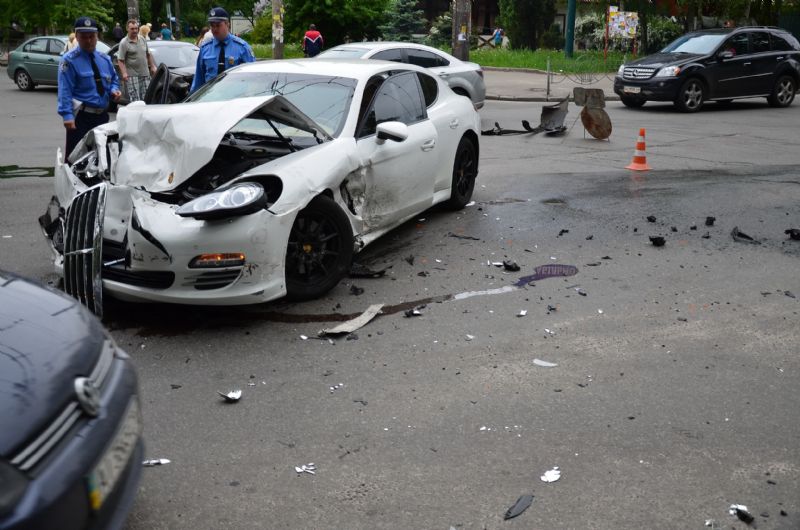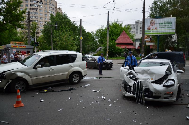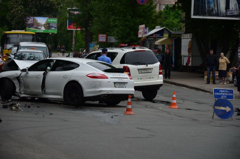Это ДТП произошло 9 мая в 16:45 в г. Киев, на перекрестке улиц Багговутовская (в советское время Маршала Буденного) – Овруцкая. Там столкнулись Porsche Panamera, SsangYong Rexton и Hyundai Accent, сообщает .