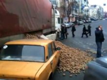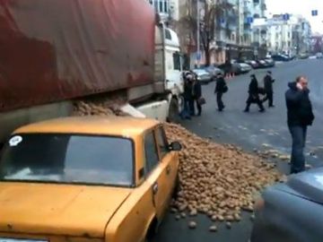 Сегодня, 29 февраля в районе НСК «Олимпийский» в Киеве образовалась пробка из-за того, что на улице Эспланадной «Жигули» завалило картошкой, высыпавшейся из фуры, сообщает .