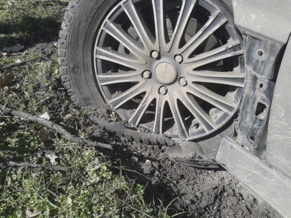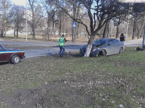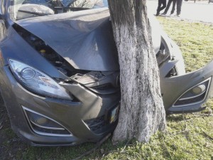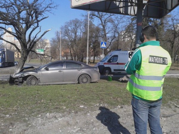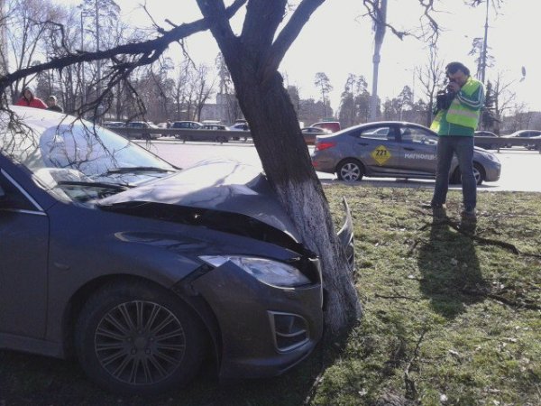 После наезда автомобиль Mazda 6 потерял управление и вылетел на обочину, где врезался в дерево.