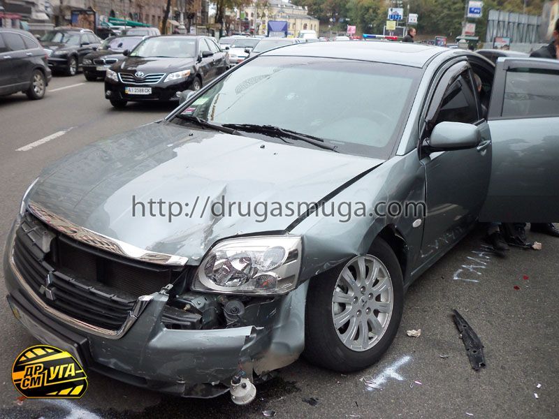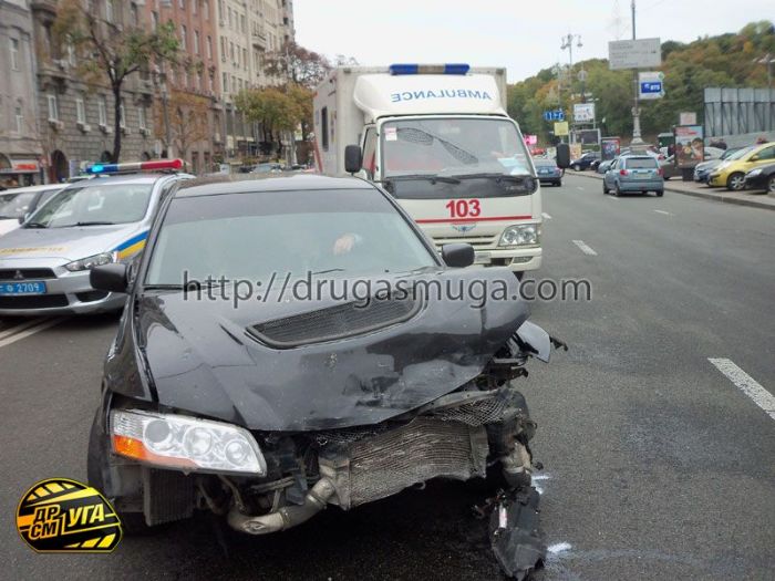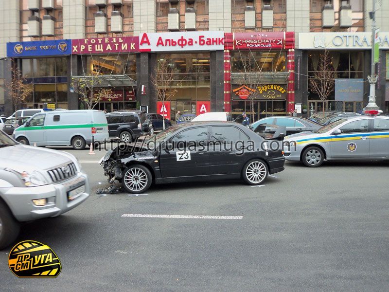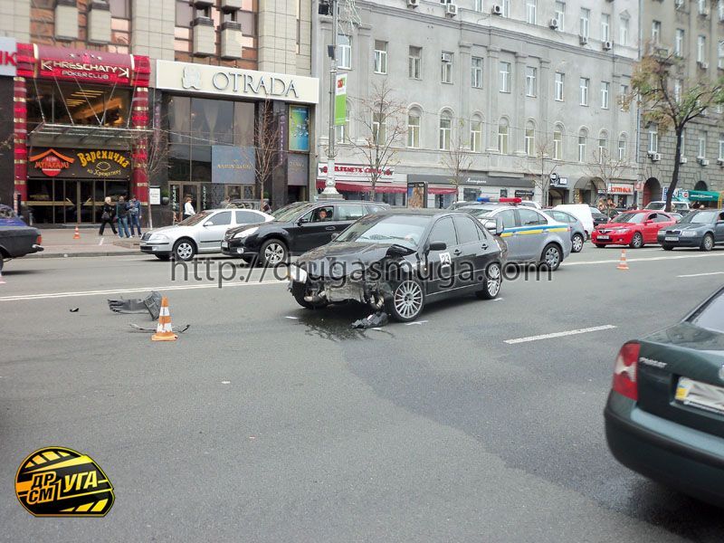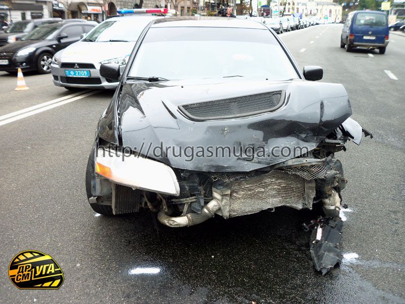 На перекрестке улиц Крещатик и Михайловской он стоял, ожидая зеленого сигнала светофора. В это время с улицы Михайловской водитель на Mitsubishi Lancer Evolution совершал поворот налево на Крещатик в направлении Европейской площади.