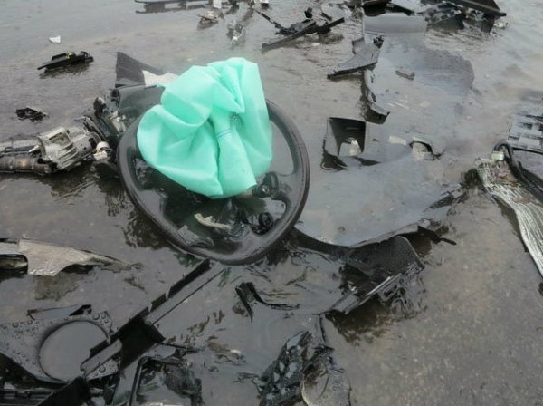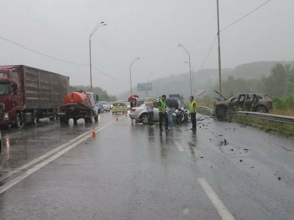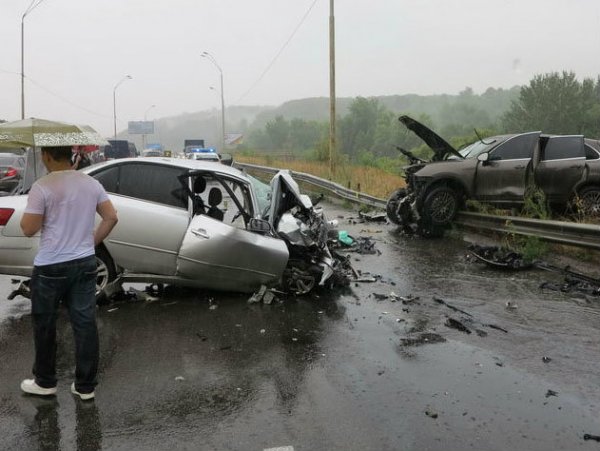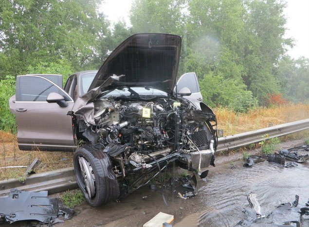 Во время дождя произошло сильнейшее лобовое столкновение Porsche Cayenne и Hyundai Sonata. В результате автомобили разбросало в стороны, "Порш" вылетел с дороги на обочину. По словам очевидца, который проезжал место ДТП через минуту после столкновения, Porsche Cayenne выехал на встречную полосу, обгоняя попутные автомобили.