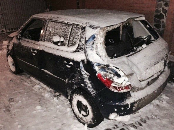 Машину увезли на эвакуаторе. У автомобиля выбиты стекла, помят капот, разбиты фары.