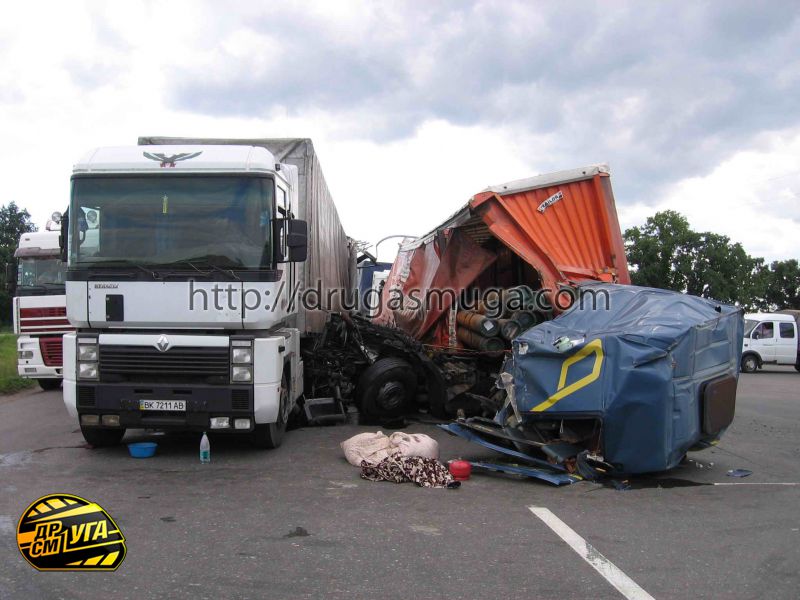 В этот самый момент в прицепе догнавшей фуры подался вперёд не зафиксированный жестко груз, он проломил передний борт прицепа и вырвал кабину тягача.
