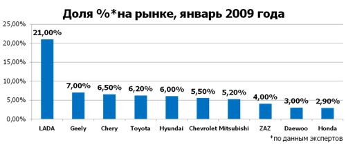 На втором месте с долей 7% китайский Geely. Если в декабре высокое 6-е место в рейтинге рассматривалось как пик возможностей китайского бренда, то в январе такого от него никто не ожидал. А это все произошло, благодаря усиленной рекламной активности начиная с сентября 2008 года. Причем содержанием этой «активности» было предоставление выгодных кредитно-лизинговых услуг. Видимо, этого потребитель и ожидал…