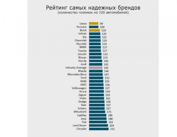 Первое место в рейтинге надежности заняли автомобили Lexus (99 неисправностей на 100 машин бренда). На втором месте — Porsche (100 проблем), а замкнул первую тройку Buick (116 неисправностей), который продавался в России под брендом Opel. Далее следуют Infinity (120) и Kia (122).