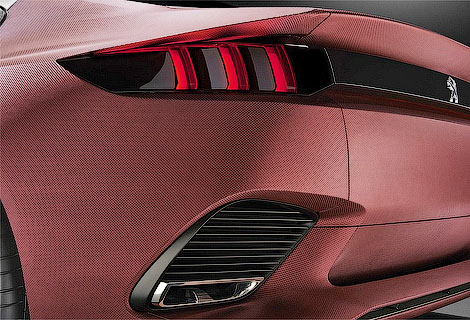 Из красной «акульей кожи» выполнена задняя часть Exalt. В Peugeot утверждают, что этот материал имеет специально нанесенное «зерно», которое помогает оптимизировать проходящие воздушные потоки, снижая коэффициент аэродинамического сопротивления.