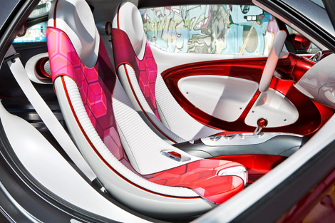 Салон двухместного автомобиля выполнен в светлых тонах. Сиденья Forstars обтянуты белой кожей и мягкой тканью, что, по замыслу дизайнеров, должно вызывать ассоциации с гамаком. Чехлы на них легко снимаются – создатели машины рассчитывали, что пассажиры смогут часто их менять по настроению.