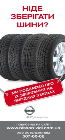 Стоит обратить внимание, что в период с 11 октября по 31 декабря 2010г. при условии проведения комплекса работ по шиномонтажу и балансировке по цене от 294 грн, Клиенты могут оставить летние шины на хранение в сервисном центре «ВиДи Санрайз Моторз» по специальной цене – 1 грн в день**. А при покупке оригинальных колесных дисков Ниссан, работы по шиномонтажу и балансировке производятся со скидкой 50%.