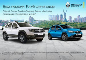Акція "Шини в подарунок" - продовжена! Кожен, хто завітає до Арма Моторс і придбає автомобіль Renault Sandero, Sandero Stepway, Dokker, Duster і Lodgy до 30 листопада включно отримує подарунок – комплект зимових шин. Кількість автомобілів, які Ви купуєте не лімітується, але кількість авто, що беруть участь у акції обмежена.