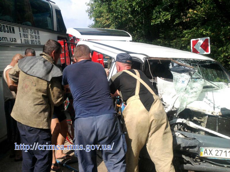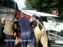 Авария произошла на автодороге "Судак-Грушевка". 66-летний водитель микроавтобуса Mercedes Vito, житель Харьковской области, не справился с управлением, выехал на встречную полосу движения и протаранил автобус "Неоплан".