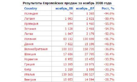 Если в сентябре кризис привел к уменьшению числа покупателей автомобилей только в девяти странах, то в ноябре под кризис попали все, кроме трех стран. Причем давление кризиса значительно усилилось. Те страны, кого кризис зацепил уже в сентябре, в ноябре показали уже катастрофическое снижение продаж вплоть до -94% в бедной Исландии. Больше чем наполовину уменьшились автомобильные рынки Ирландии, Испании и всех трех прибалтийских государств. Тяжело приходится скандинавам и Великобритании. Даже самые богатые страны Европы испытывают проблемы. Причем Швецию, Германию, Голландию, Бельгию лихорадит больше всех. В Европе все-таки остались страны, чей авторынок живет отдельно от глобального кризиса. Большая Польша в ноябре 2008 года нарастила продажи автомобилей на 3,1% по сравнению с ноябрем 2007 года. В Португалии рост составил 8,9%. Фантастическая ситуация сложилась в Финляндии: при общем значительном спаде продаж новых автомобилей в Финляндии рост составил 77,5%. Вместо 3631 автомобиля, купленного финнами в 2007 году, в 2008 году финны приобрели 6445 автомобилей.