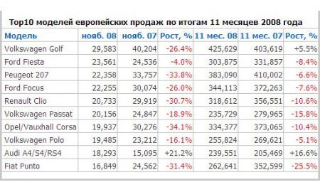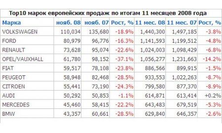 Предпочтения европейцев по части автомобильных брендов и моделей автомобилей традиционны. В топ-10 лидеров ноября по продажам попали только европейские марки. Никаких японцев и американцев. Даже Toyota, попадавшая обычно в десятку, в ноябре уступила свое место дорогим, но своим для европейцев автомобилям BMW. При этом, в отличие от сентября, все десять компаний-лидеров испытывают серьезное падение продаж в ноябре. Даже Audi, демонстрировавшая рост продаж еще в сентябре за счет вывода новых моделей A4 и Q5, в ноябре перешла в незначительный минус. Самые большие проблемы среди лидеров рынка в ноябре у Opel, Peugeot и BMW. По итогам 11 месяцев Opel также показал более резкий спад продаж, чем в среднем по рынку.