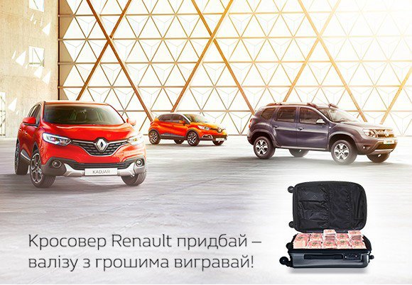 Арма Моторс оголошує про запуск Акції «Кросовер Renault придбай – валізу з грошима вигравай» від компанії Renault в Україні, яка триватиме з 2 по 30 листопада 2016 р.