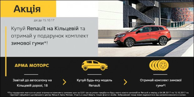 З 4 вересня по 15 жовтня 2017 р. при покупці автомобіля Renault у Арма Моторс на Кільцевій – даруємо комплект зимових шин у подарунок!*.