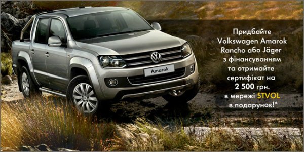 Шановні клієнти! Раді Вам повідомити, що купуючи Volkswagen Amarok Rancho або Jager з фінансуванням від Porsche Finance Group, Ви гарантовано отримуєте подарунковий сертифікат мережі STVOL номіналом 2 500 грн.!.