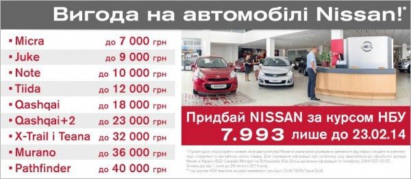*Имеется ввиду разница между стандартной и специальной ценой на автомобили Nissan, которая действует с 01.01.14 по 28.02.14 в официального дилера Nissan в Украине ООО «ВиДи Санрайз Моторз» на ул. Большая Кольцевая, 60а.