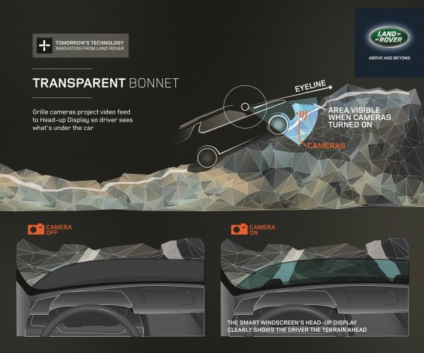 Камеры, расположенные на решетке радиатора автомобиля, фиксируют информацию и передают ее на дисплей, эффектно создавая «сквозной обзор» поверхности через капот и отсек двигателя, открывая новый уровень помощи водителю. Технология, названная своими создателями Прозрачный Капот, демонстрирует, как прогрессивная технология перенесет непревзойденные возможности Land Rover на новый уровень.