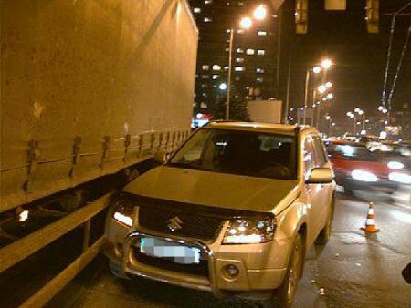 Девушка-водитель Suzuki, по вежливости своей души, пропускала других участников движения, которые выезжали со светофора с Харьковского шоссе на перекресток. Водитель фуры DAF решил объехать легковушку справа. Не успела девушка убрать ногу с педали тормозов, как услышала скрежет. Не смотря на завывания клаксона Vitara, фура полуприцепом очень хорошо протерла бампер и часть крыла внедорожника.