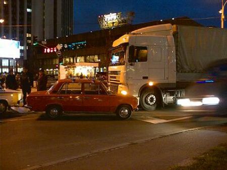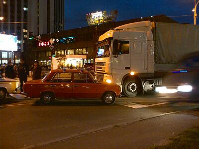 3 ноября на Ленинградской площади при повороте на кольцо в сторону ул. М. Расковой не смогли просто разъехаться фура DAF и ВАЗ первой модели, сообщает .
