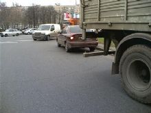 На Ленинградской площади, на повороте с Харьковского шоссе в сторону проспекта Воссоединения, водитель Daewoo Lanos по неопытности (автомобилем он управляет всего два месяца) влетел под МАЗ, сообщает .