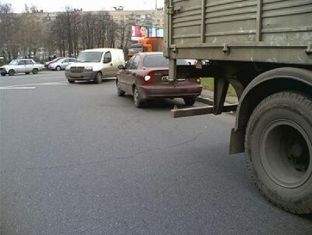 Поскольку грузовику нужен большой радиус для поворота, то водитель грузовика мало того, что не заметил легковушки, которая путалась у него под колесами, так еще и утверждает, что Daewoo попал в „мертвую зону” его зеркала.
