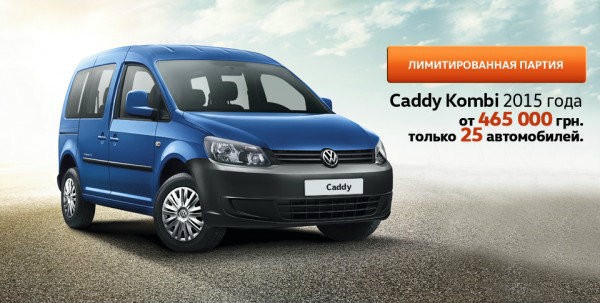 Мы приготовили автомобили из специальной европейской партии Caddy Kombi 2015 года выпуска по цене всего от 465 000 грн. (цена указана в гривне на 12.12.2016), которые уже сегодня можно купить в автоцентре официального дилера Volkswagen в Киеве «Атлант-М Днепровская набережная».