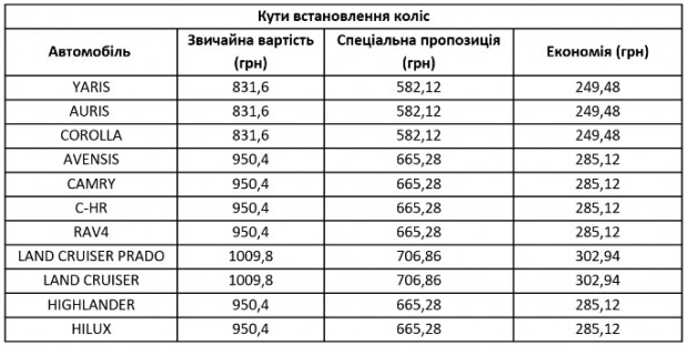 Саме тому ми розробили спеціальну вигоду на роботи з перевірки та регулювання кутів установлення коліс у розмірі 30 % від їх вартості*: