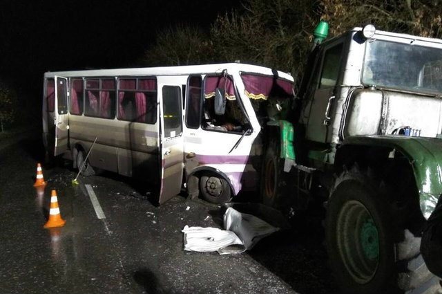 "37-летний водитель, управляя пассажирским автобусом "БАЗ", зацепил левой стороной навесное оборудованием трактора "К-700", после чего потерял управление автобусом и допустил лобовое столкновение с трактором "Т-150", который двигался во встречном направлении позади трактора "К-700", – рассказали правоохранители.