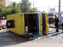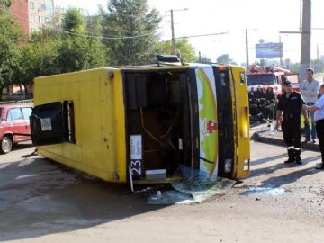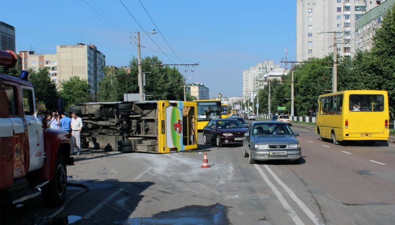Это ДТП произошло 23 июля, около 08:00, во Львове на ул. Сиховской. Водитель автобуса «БАЗ-А079.14» в результате технической неисправности (разлом коренного листа рессоры передней левой подвески), не справился с управлением, выехал на полосу встречного движения и перевернулся.
