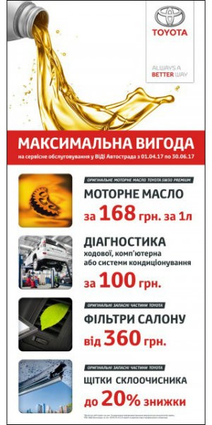 Только с 20 апреля по 30 июня 2017 всем клиентам Тойота Центр Киев ВиДи Автострада предоставляется возможность максимально выгодно воспользоваться услугами официального сервиса Тойота!
