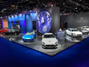 На стенде Maserati представил 3 версии спортивного седана Ghibli, 2 версии представительской модели Quattroporte 6-го поколения, а линейка GT представлена моделями GranTurismo MC Stradale Centennial Edition и GranCabrio Sport.
