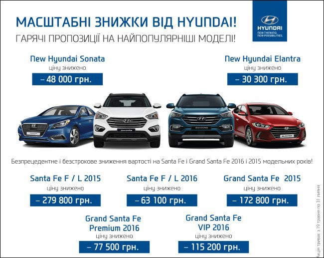 Именно сейчас самая популярная модель Hyundai TUCSON продается со скидкой до 15 800 грн., а флагман модельного ряда Hyundai Santa Fe со скидкой до 279 000 грн.!