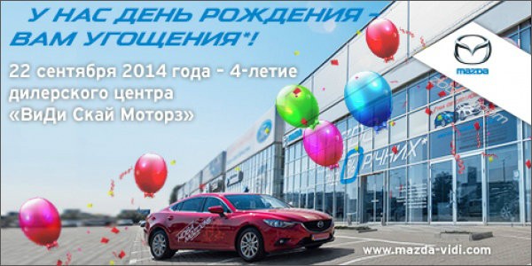 22 сентября 2014 года у всех поклонников автомобилей Mazda есть уникальная возможность провести день с пользой и воспользоваться специальными предложениями от «ВиДи Скай Моторз». Клиенты, которые заключат договор на покупку автомобиля в этот день, смогут сделать это с приятной экономией (условия специального предложения посетителям расскажут консультанты в салоне).