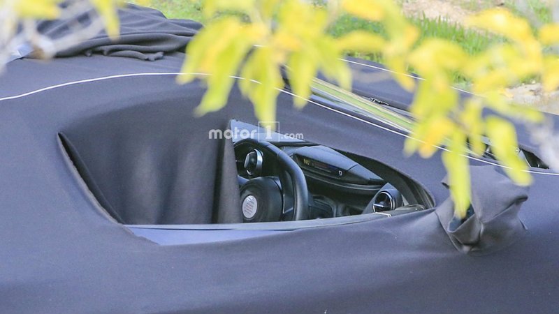 Шпионская фотография интерьера нового суперкара предоставлена сайтом Motor1.com. Предполагается, что в трековом режиме приборка будет убираться в переднюю панель, улучшая обзорность и оставляя только важную информацию: передачу и обороты двигателя.