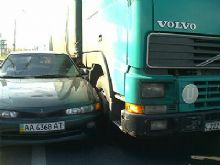 На съезде с Московского моста на Московский проспект, по направлению к Троещине, в крайней правой полосе фура Volvo прижала легковушку Mitsubishi Galant, сообщает .