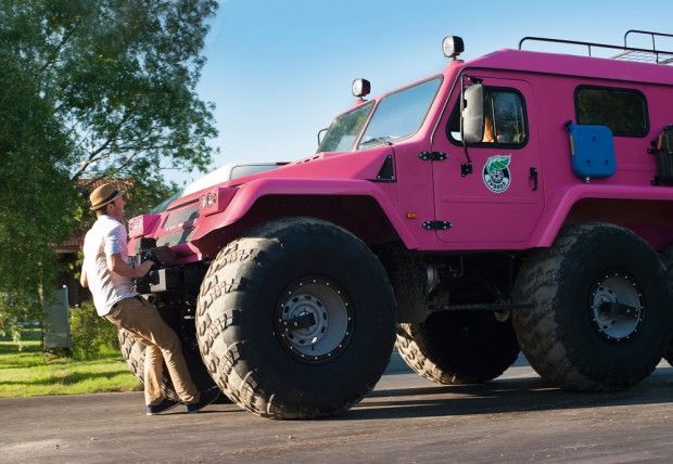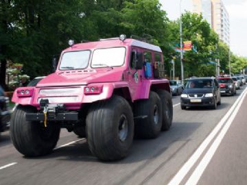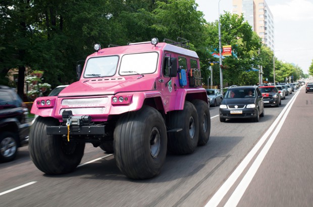 Это российский плавающий шестиколёсный вездеход на шинах сверхнизкого давления, который, судя по этим фото, вполне может сойти за женский автомобиль — на таком можно и на сотрудников ГАИ не обращать внимание, и поворотниками не пользоваться и, если пробка, объехать ее по крышам других авто или попросту переплыть через реку.