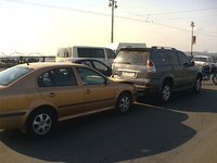 У автомобиля Prado не обнаружилось даже царапин на бампере. А вот Skoda Octavia повезло меньше, у нее капот гармошкой, пострадала передняя решетка, фары.