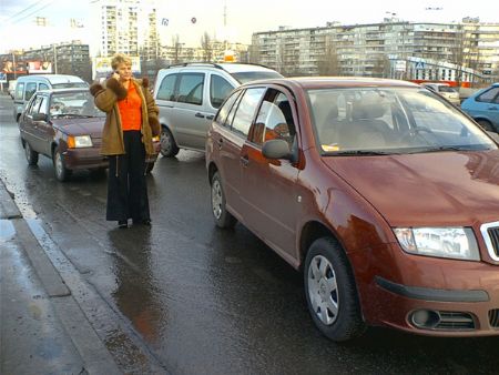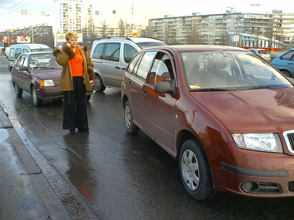 Водители уже минут 20 решают, вызывать им ГАИ или нет. Женщина-водитель Fabiа настаивает на том, чтобы таки вызвать инспекторов дорожной милиции, поскольку ее машина застрахована.