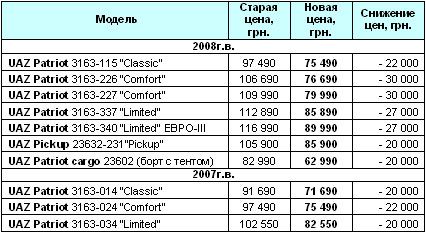 Цены снижены как на флагман модельного ряда «УАЗов» внедорожник UAZ Patriot, так и на недавнюю новинку ульяновского автопроизводителя – UAZ Pickup. Комплектация Comfort c расширенным рядом опций обойдется всего за 76 690 грн. Ценовая разница в этом случае наивысшая и составит 30 000 грн. Максимальная комплектация Limited с двигателем «Евро-3», которая появилась в 2008 году, теперь стоит 89 990 грн. Это на 27 000 грн. дешевле, чем раньше. Пикапы и бортовые автомобили Patriot потеряли в цене 20 000 грн. Совсем свежий ценник, равный 105 900 грн., на UAZ Pickup уже сменили на 85 900 грн, а цена на бортовой грузовик нынче составляет 62 990 грн. Самые привлекательные цены установлены на модели 2007 года. Так, UAZ Patriot прошлого года выпуска в стандартной комплектации можно купить за 71 690 грн., что на 20 000 грн. ниже прежней цены.