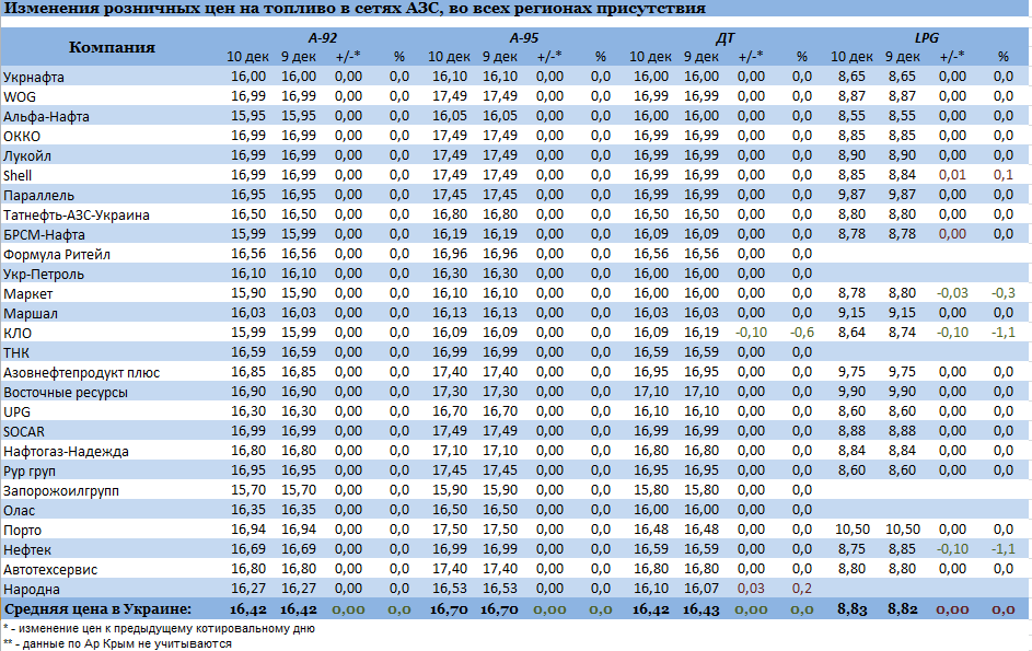 Сегодня, 10 декабря, цены на бензин в Украине остались на прежнем уровне. Средняя стоимость "двойки" зафиксировалась на отметке 16,42 грн/л, а "пятерки" – 16,70 грн/л. Об этом свидетельствуют данные мониторинга Консалтинговой группы "А-95", сообщает .