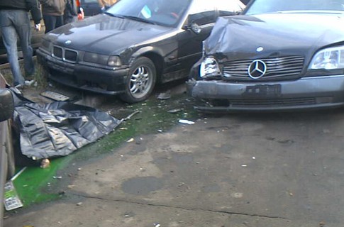 После наезда на пешехода, водитель около 100 метров провез ее на капоте, после чего совершил столкновение с двумя припаркованными у бровки автомобилями BMW 3 серии, а также зацепил Peugeot 405.