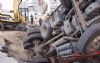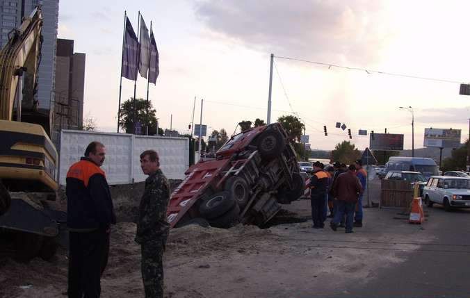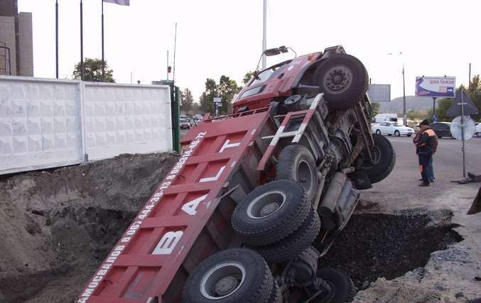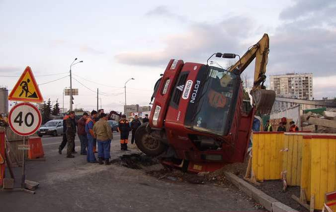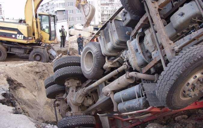 По словам водителя грузовика, он припарковал машину на краю ямы. Неожиданно край не выдержал, осыпался и увлек за собой грузовик. Люди не пострадали в этом чрезвычайном происшествии. Поскольку на стройке в тот момент крана не было, то с извлечением несчастного транспортного средства у рабочих возникли большие проблемы.