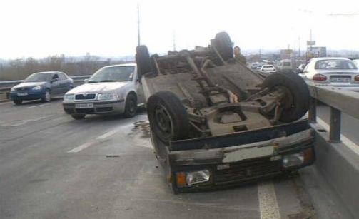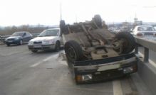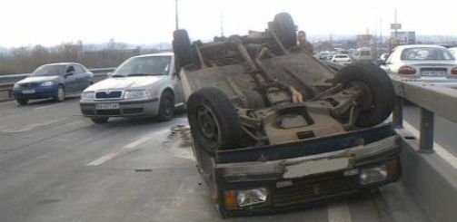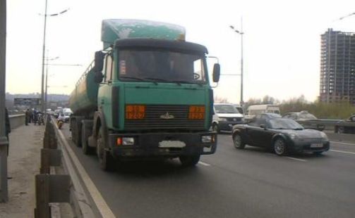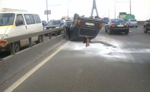 Автомобиль ВАЗ 2104 ехал по мосту в направлении Троещины в правом ряду. Во втором ряду двигался безновоз МАЗ. В определенный момент он начал перестраиваться в правый ряд. При этом бензовоз ударил ВАЗ в заднюю часть. Машину начало разворачивать. Авто резко ушло из правого ряда в крайний левый и налетело на отбойник, после чего перевернулось. В аварии никто не пострадал.