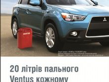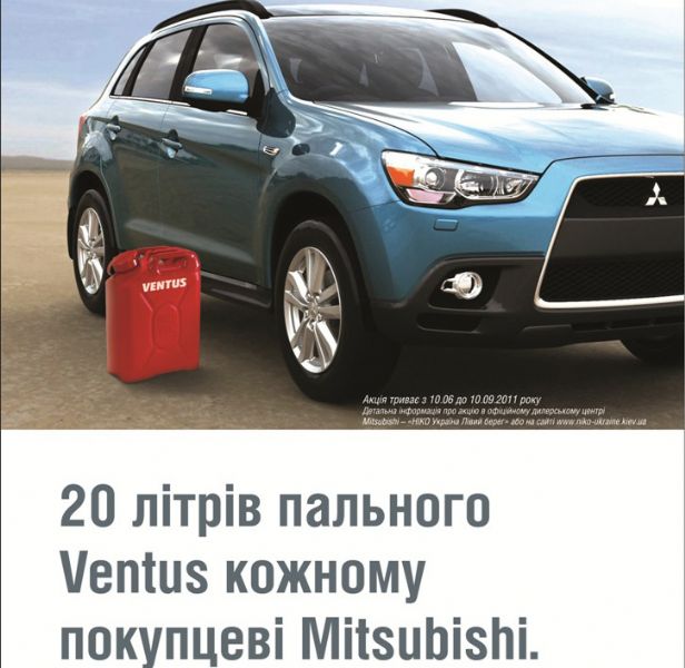 Только в официальном дилерском центре Mitsubishi Motors - «НИКО-Украина Левый берег», с 10го июня по 10ое сентября 2011 года, каждый покупатель автомобиля Mitsubishi гарантировано получает пакет приятных подарков* «VENTUS» и, самое главное, 20л фирменного европейского топлива «VENTUS» от столичной сети автозаправочных комплексов «КЛО».