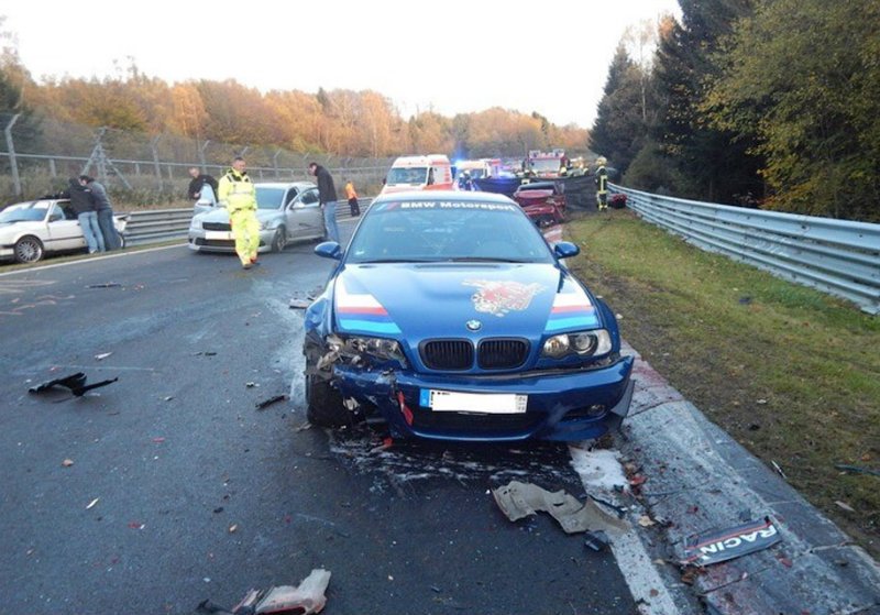 Авария произошла в повороте Hatzenbach из-за утечки охлаждающей жидкости у Porsche 911 GT3 RS. Автомобили не могли затормозить перед виражом и теряли управление. В ДТП пострадали два человека, а еще один водитель был отправлен в больницу на вертолете.