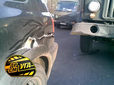 Во время перестроения правее, водитель грузовика не заметил легковушку и правой частью своего переднего бампера зацепил заднее левое крыло VW. Бампер большегруза до дыры разорвал крыло Golf-а и оставил на нем глубокую вмятину. Вследствие ДТП оказались заблокированы две полосы движения, вследствие чего на ул. Е. Телиги образовалась пробка.