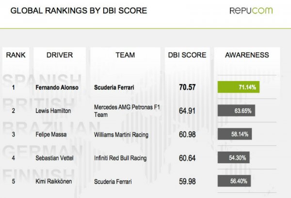 "Для некоторых может быть сюрпризом то, что Феттель не стал лидером с точки зрения мирового мнения, как Алонсо, Хэмилтон и Масса. Лидерство Алонсо в рейтинге обеспечивается благодаря его международным контрактам и партнерству с Ferrari. Несмотря на недавние успехи Red Bull, глобально 51% фанатов F1 следят за командой Ferrari – это наивысший уровень интереса из всех команд. А учитывая количество Гран При, проходящих в разных странах, и общую аудиторию трансляций, насчитывающую 1,8 млрд зрителей, мы можем увидеть всю важность влияния подобного восприятия", - прокомментировал старший вице-президент Repucom, отвечающий за автоспорт, Найджел Гич.