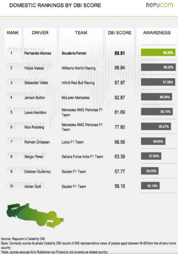 По итогам анализа всех данных, выяснилось, что 71,14% респондентов в мире и 98,35% респондентов в Испании знают, кто такой Фернандо Алонсо (что и сделало испанца лидером рейтинга). В США о нем знают только 12,76% опрошенных – причем большей части из них испанец нравится (84,5%), а 76,74% лояльных американцев заявили, что его личность оказывает некоторое влияние на выбор того или иного продукта (ведь у каждого призового пилота в F1 есть свои спонсоры).